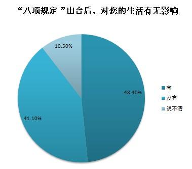 截至2013年12月20日10時,共收到網(wǎng)絡(luò)問卷2442份,48.4%的受訪者認(rèn)為“八項規(guī)定”對個人生活有影響,其中公務(wù)員群體認(rèn)為“八項規(guī)定”帶來的最大影響是“公務(wù)吃請少了,能抽出更多時間陪伴家人”和“津貼補貼獎金少了,勒緊褲帶過日子”,非公務(wù)員群體認(rèn)為“八項規(guī)定”帶來的最大影響是“酒店、高端會所門外的公務(wù)用車少了”和“遇到領(lǐng)導(dǎo)考察工作時,地毯鮮花迎送領(lǐng)導(dǎo)的情況少了”。