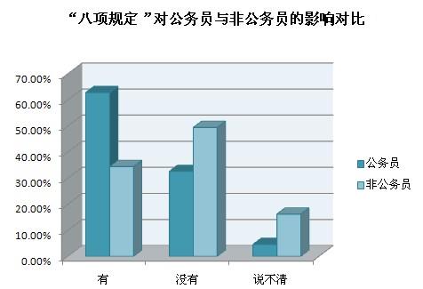 “八項規(guī)定”出臺后,對您的生活有無影響?”針對這一題,48.4%的受訪者選擇“有影響”,41.1%選擇“無影響”,10.5%“說不清”。從調(diào)查結(jié)果來看,“八項規(guī)定”對公務(wù)員群體的影響大于非公務(wù)員群體,受訪者中分別有62.8%的公務(wù)員和34.4%的非公務(wù)員選擇了“有影響”,前者比后者多28.4%。但是,回答“說不清”的比例,后者(16.2%)高于前者(4.6%),表明普通民眾相比于公務(wù)員對“八項規(guī)定”是否影響個人生活的認(rèn)知相對模糊。