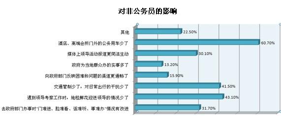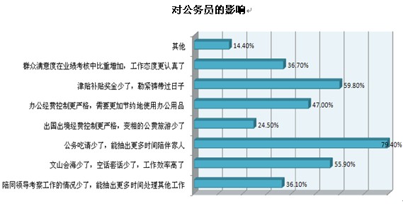 還有三到五成受訪公務(wù)員認(rèn)為“辦公經(jīng)費控制更嚴(yán)格,需要更加節(jié)約地使用辦公用品”、“群眾滿意度在業(yè)績考核中比重增加,工作態(tài)度更認(rèn)真了”和“陪同領(lǐng)導(dǎo)考察工作的情況少了,能抽出更多時間處理其他工作”是“八項規(guī)定”帶來的幾大影響。