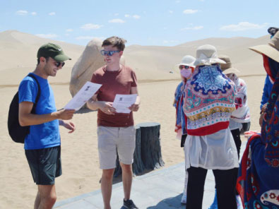 在敦煌的鳴沙山與月牙泉,兩名英國劍橋大學的大學生對“一帶一路”和“絲綢之路”概念的熟知程度令團隊成員十分驚訝,外國青年對中國的文化歷史的濃厚興趣也令交流采訪十分順利和有趣。