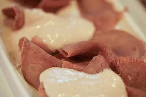 在意大利多種多樣的開胃菜中,Carpaccio是最傳統(tǒng)與常見的一種,“Carpaccio”是“生冷牛肉”的意思。帶血色的新鮮生牛肉切片平鋪在碟子上,牛肉片上擺放些芝士。Carpaccio的關鍵在于生牛肉,配菜則可以自由發(fā)揮。