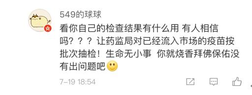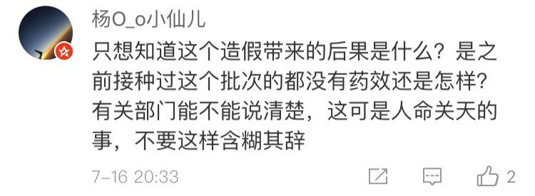 網(wǎng)友“楊O_o小仙兒”表示:“只想知道這個(gè)造假帶來的后果是什么?是之前接種過這個(gè)批次的都沒有藥效還是怎樣?有關(guān)部門能不能說清楚,這可是人命關(guān)天的事,不要這樣含糊其辭!