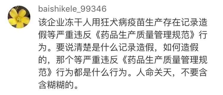網(wǎng)友“baishikele_99346”認(rèn)為:“要說清楚是什么記錄造假,如何造假的,那個(gè)等嚴(yán)重違反《藥品生產(chǎn)質(zhì)量管理規(guī)范》行為的都是什么行為。人命關(guān)天,不要含含糊糊。”