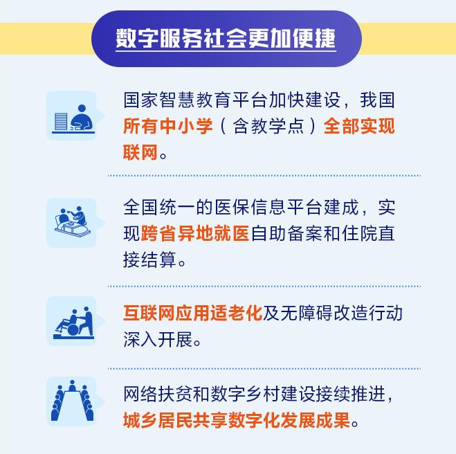 與此同時(shí),《報(bào)告》介紹,在數(shù)字服務(wù)社會(huì)方面,國(guó)家智慧教育平臺(tái)加快建設(shè),我國(guó)所有中小學(xué)(含教學(xué)點(diǎn))全部實(shí)現(xiàn)聯(lián)網(wǎng)。全國(guó)統(tǒng)一的醫(yī)保信息平臺(tái)建成,實(shí)現(xiàn)跨省異地就醫(yī)自助備案和住院直接結(jié)算;ヂ(lián)網(wǎng)應(yīng)用適老化及無(wú)障礙改造行動(dòng)深入開(kāi)展。網(wǎng)絡(luò)扶貧和數(shù)字鄉(xiāng)村建設(shè)接續(xù)推進(jìn),城鄉(xiāng)居民共享數(shù)字化發(fā)展成果。